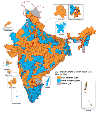 General elections were held in India from 19 April to 1 June 2024 in seven phases, to elect all 543 members of the Lok Sabha. Votes were counted and the result was declared on 4 June to form the 18th Lok Sabha. On 7 June 2024, Prime Minister Narendra Modi confirmed the support of 293 MPs to Droupadi Murmu, the president of India. This marked Modi's third term as prime minister and his first time heading a coalition government, with the Telugu Desam Party of Andhra Pradesh and Janata Dal (United) of Bihar emerging as two main allies.