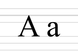 It is similar in shape to the Ancient Greek letter alpha, from which it derives. The uppercase version consists of the two slanting sides of a triangle, crossed in the middle by a horizontal bar. The lowercase version is often written in one of two forms: the double-storey |a| and single-storey |ɑ|. The latter form is commonly used in handwriting and fonts based on it, especially fonts intended to be read by children, and is also found in italic type.