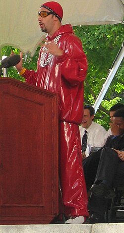 ![]() Ali G giving a commencement speech at Harvard University in 2004 | |
