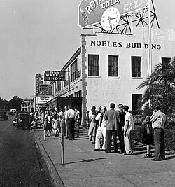 Several theories have been put forward for the origin of the term in a film context. One explanation pertains to the practice of "block booking" whereby a studio would sell a package of films to theaters, rather than permitting them to select which films they wanted to exhibit. However, this practice was outlawed in 1948 before the term became common parlance; while pre-1948 high-grossing big-budget spectacles may be retroactively labelled "blockbusters," this is not how they were known at the time. Another explanation is that trade publications would often advertise the popularity of a film by including illustrations showing long queues often extending around the block, but in reality the term was never used in this way. The term was actually first coined by publicists who drew on readers' familiarity with the blockbuster bombs, drawing an analogy with the bomb's huge impact. The trade press subsequently appropriated the term as short-hand for a film's commercial potential. Throughout 1943 and 1944 the term was applied to films such as Bataan, No Time for Love and Brazil.