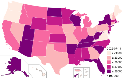 COVID-19 cases per 100,000 people by state, as of July 11, 2022