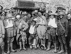 British, French and Italian casualties, many wearing slings or medical dressings, during the Second Battle of the Marne (1918). In spite of their injuries, most of them appear cheerful. To maintain morale at home, the government released propaganda photos such as these, showing that even injured troops remained positive and determined.