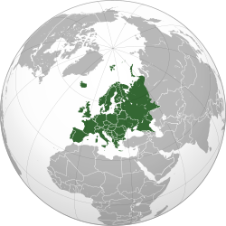 Key: blue: states which straddle the border between Europe and Asia; green: countries not geographically in Europe, but closely associated with the continent