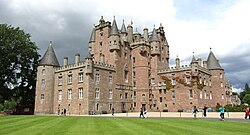 Glamis Castle is situated beside the village of Glamis (/ˈɡlɑːmz/, glahmz) in Angus, Scotland. It is the home of the Earl of Strathmore and Kinghorne, and is open to the public.