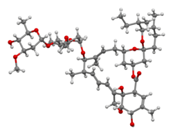 Fermentation of Streptomyces avermitilis yields eight closely related avermectin homologues, of which B1a and B1b form the bulk of the products isolated. In a separate chemical step, the mixture is hydrogenated to give ivermectin, which is an approximately 80:20 mixture of the two 22,23-dihydroavermectin compounds.
