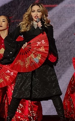 Madonna performing "Bitch I'm Madonna" at the Rebel Heart Tour (2015–2016). The song's music video became her first clip to cross 100 million views on platform Vevo.