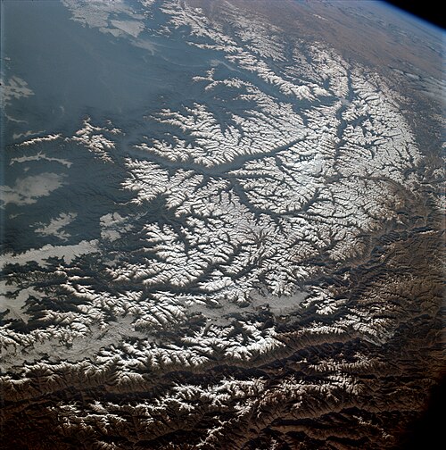 The Alpide belt stretches 15,000 km across southern Eurasia, from Java in Maritime Southeast Asia to the Iberian Peninsula in Western Europe, including the ranges of the Himalayas, Karakoram, Hindu Kush, Alborz, Caucasus, and the Alps. The Himalayas contain the highest mountains in the world, including Mount Everest, which is 8,848 metres (29,029 ft) high.