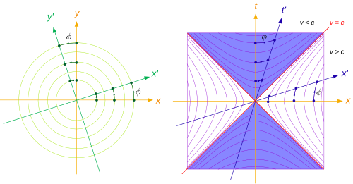 Orthogonality and rotation of coordinate systems compared between left: Euclidean space through circular angle ϕ, right: in Minkowski spacetime through hyperbolic angle ϕ (red lines labelled c denote the worldlines of a light signal, a vector is orthogonal to itself if it lies on this line).
