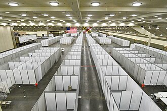 Early in the COVID-19 pandemic, convention centers (pictured here) were deemed to be ideal sites for temporary hospitals, due to their existing infrastructure (electrical, water, sewage). Hotels and dormitories were also considered appropriate because they can use negative pressure technology.