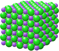The crystal structure of sodium chloride, NaCl, a typical salt. The purple spheres represent sodium cations, Na+, and the green spheres represent chloride anions, Cl−. The yellow stipples show the electrostatic forces.