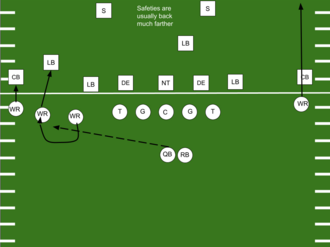 This is an example of a bubble screen pass against a basic 3-4 defense. The two outside wide receivers on the left will block for the slot receiver running the bubble screen.