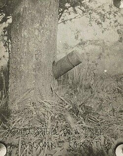 Dud shell lodged in a tree, Argonne Forest, World War I