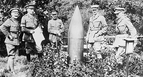 British and Belgian officers stand beside an unexploded German shell in Flanders, during World War I.