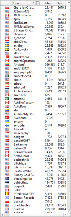 A list of users in a chat room on Soulseek, with country flags to indicate where each user is from