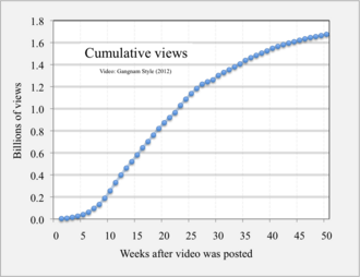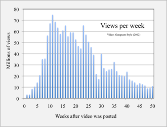 Video views per week of a viral video (Gangnam Style), illustrating viral growth to peak weekly viewership – in this case, in the eleventh week after it was posted