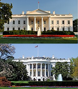 Bottom: the Executive Residence's southern façade with a semi-circular portico facing the South Lawn and The Ellipse in 2006