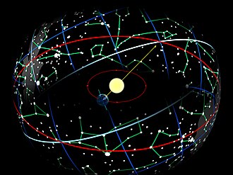 The Earth's orbit around the Sun causes the apparent motion of the latter along the ecliptic (red). Earth is axially tilted 23.4° relative to this plane; its equator, extended to the stars, is shown in light blue.